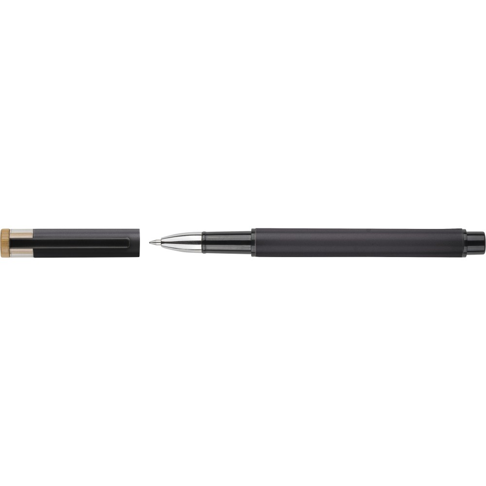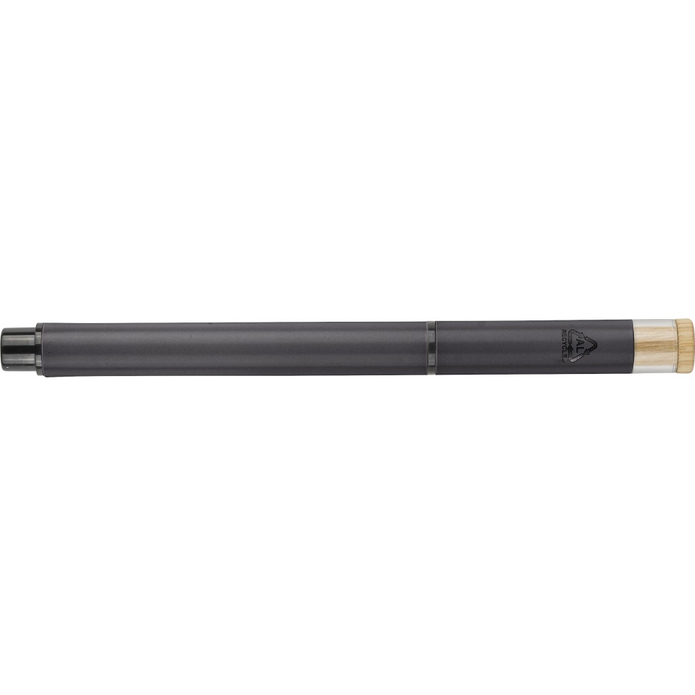 Újrahasznosított alumíniumból készült, lakkozott tollszett golyóstollal és rollerball tollal. A golyóstoll bambusz nyomógombbal, rPET díszítéssel és fém klippel rendelkezik, míg a rollerball toll bambusz/rPET kupakdíszítéssel és hozzá illeszkedő klippel. A tolltesten gravírozott recycled (újrahasznosított) alapanyagra utaló logó található mindkét toll esetében. A golyóstoll kb. 700 méter, a roller toll kb. 500 méter íráskapacitású, mindkettő kék színű tollbetéttel. Színes, újrahasznosított kartonból készült ajándékdobozba csomagolva.