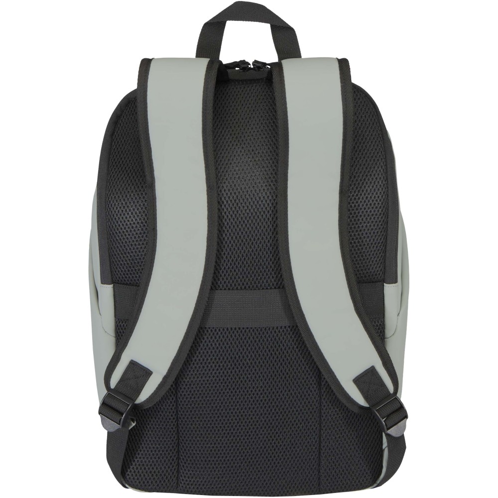 A prémium minőségű, GRS tanúsítvánnyal rendelkező újrahasznosított PU bőrből készült, színben passzoló RPET béléssel ellátott 15?-os biztonsági hátizsák garantálja az értékek védelmét és szárazon tartását útközben. A termék hátulról hozzáférhető laptoprekeszel, két letisztult oldalsó zsebbel, valamint egy vízálló cipzárral felszerelt elülső zsebbel rendelkezik. A légáteresztő hátlap biztosítja az egész napos kényelmet, így ideális választás ingázáshoz, utazáshoz vagy városi használatra. Űrtartalma: 18 liter.
