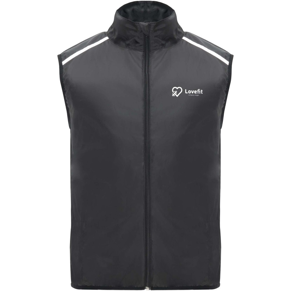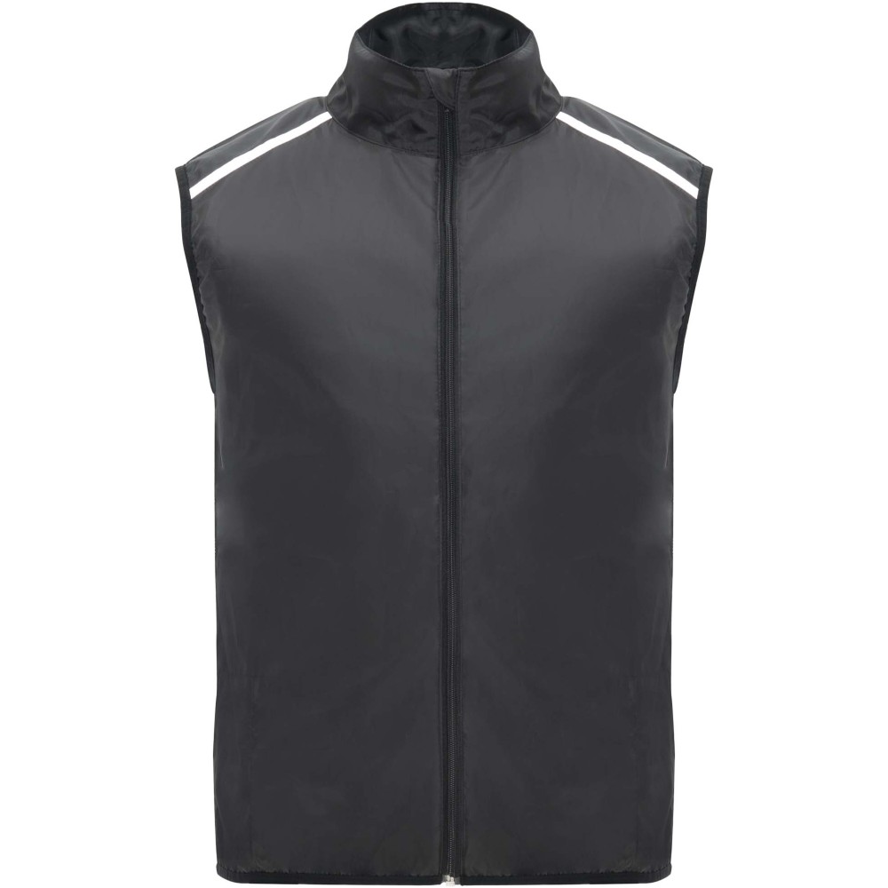 Szélálló és légáteresztő. Elülső cipzár azonos színű állvédővel. Rugalmas szegély a karkivágásnál és az alján. A hát alsó része mikroperforált anyagból készült. Fényvisszaverő csíkok a vállán. Zseb rugalmas pánttal, amelybe a mellényt el lehet csomagolni. Eltávolítható címke.