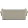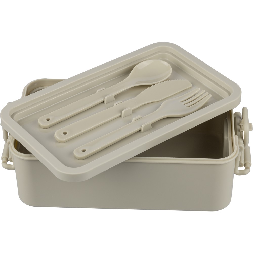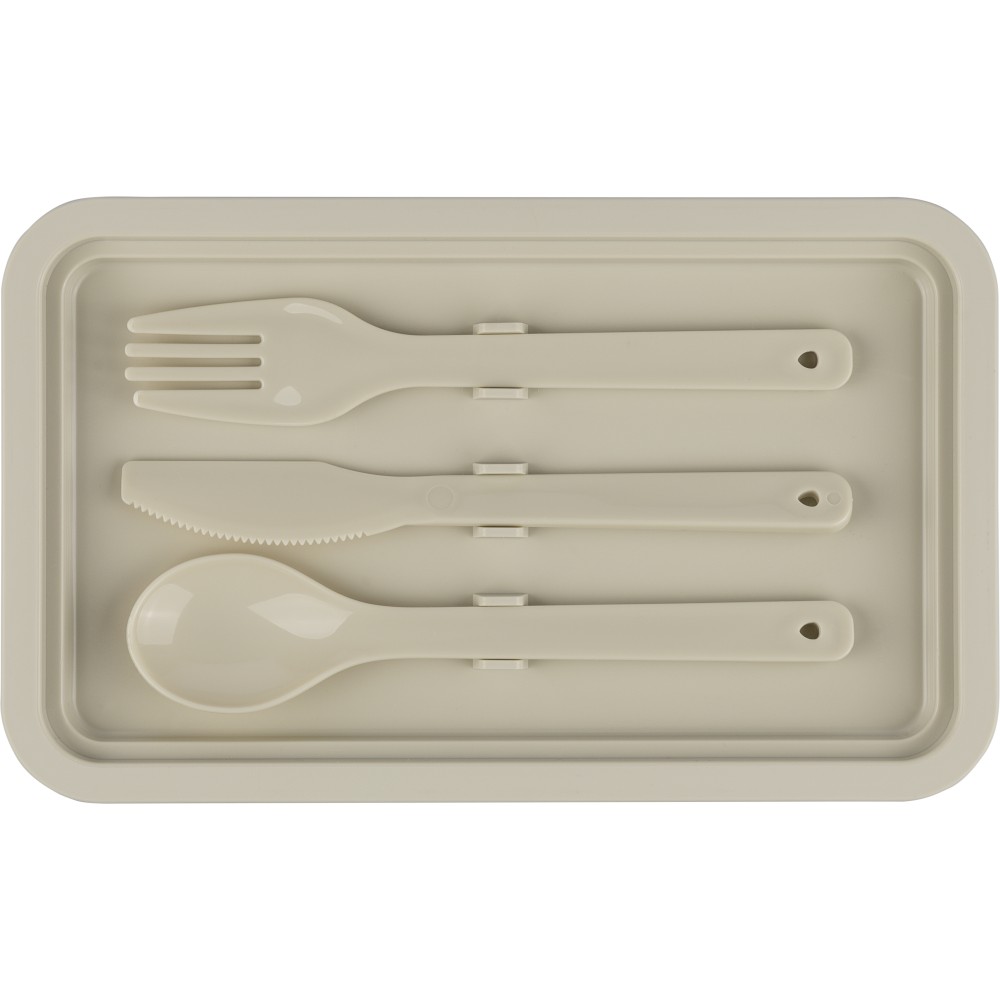 PP anyagból készült, két szintes ételtároló doboz csatos záródással és PP fedéllel. A kisebb alsó rekesz a helytakarékosság érdekében a felsőbe illeszthető. Köztes réteggel rendelkezik, amely háromrészes evőeszközkészletet tartalmaz. Űrtartalma 2 200 ml. Nincs egyenként csomagolva.